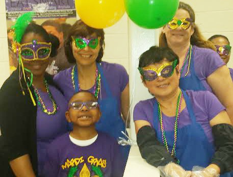 From left, Fayetteville Elementary School Nutrition Program staffers Sylvia Grayer, Patrizia Mattesco, Doris Ng, Stacey Green and Tanya Wilson get into the spirit of Mardi Gras as student Aiden Joseph shows off the special menu items they cooked for the celebration.