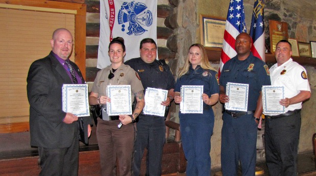 From left are Detective Scott Israel, Fayetteville Police Dept.; Deputy Tabatha Denson, Fayette County Sheriff’s Dept.; Lt. Ken Ralls, Peachtree City Police Dept.; Firefighter Stephaene Core, Firefighter of the Year, Fayetteville Fire Dept.; Firefighter Wendell Madison, Fayette County Fire & EMS; and Chief Joe O’Conner, representing Firefighter Joshua Himes, Peachtree City Fire Dept. who is currently on duty with the U.S. Navy.