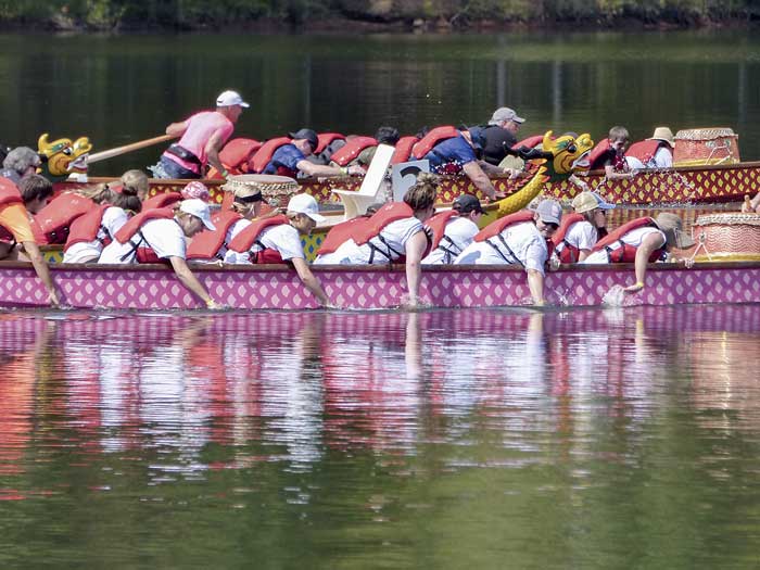 Below, a team digs in to skim their dragon boat across Lake McIntosh. Photo/Markus Schwab Photography.