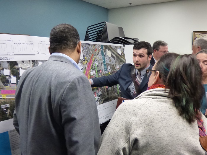 The large crowd of people gathered around the maps showing the look of the intersection, and with DOT staff answering questions. Also on display was a large screen showing a new animation of the intersection and the traffic flow through it.