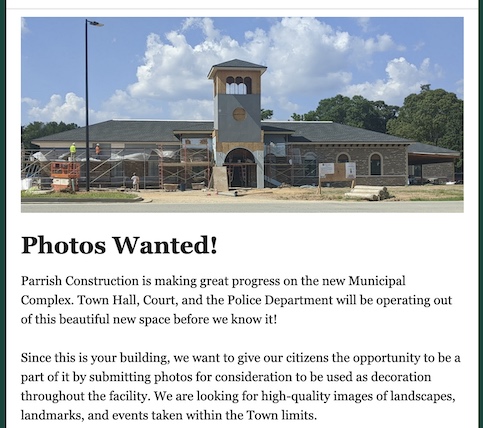 “Since this is your building, we want to give our citizens the opportunity to be a part of it by submitting photos for consideration to be used as decoration throughout the facility. We are looking for high-quality images of landscapes, landmarks, and events taken within the Town limits,” said Town Manager Brandon Perkins.