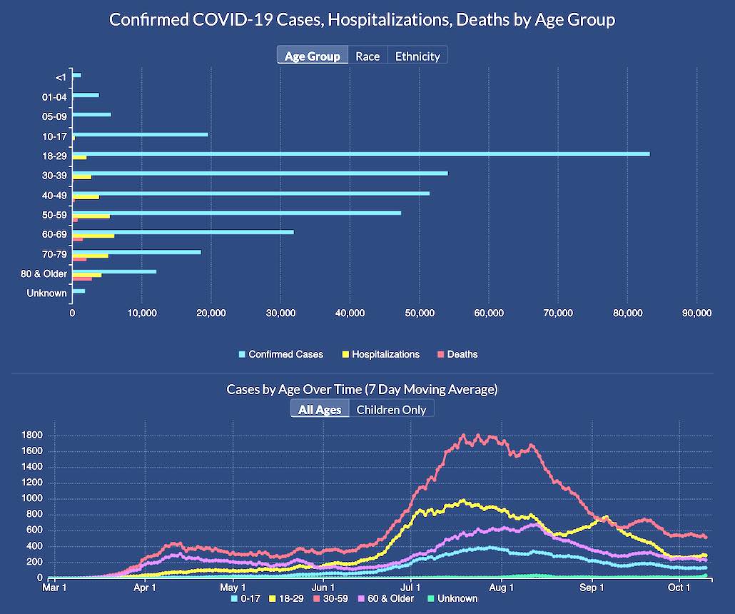 Oct. 10 Cases by Age — Age 0 to 4: 15 (+0). Age 5 to 14: 72 (+0). Age 15 to 24: 384 (+1). Age 25 to 34: 237 (+0). Age 35 to 44: 254 (-2). Age 45 to 54: 339 (+0). Age 55 to 64: 311 (+0). Age 65 to 74: 182 (+0). Age 75 to 84: 94 (+0). Age 85 Plus: 45 (+0). Age Unknown: 20 (+0). TOTAL: 1,953 (-1).