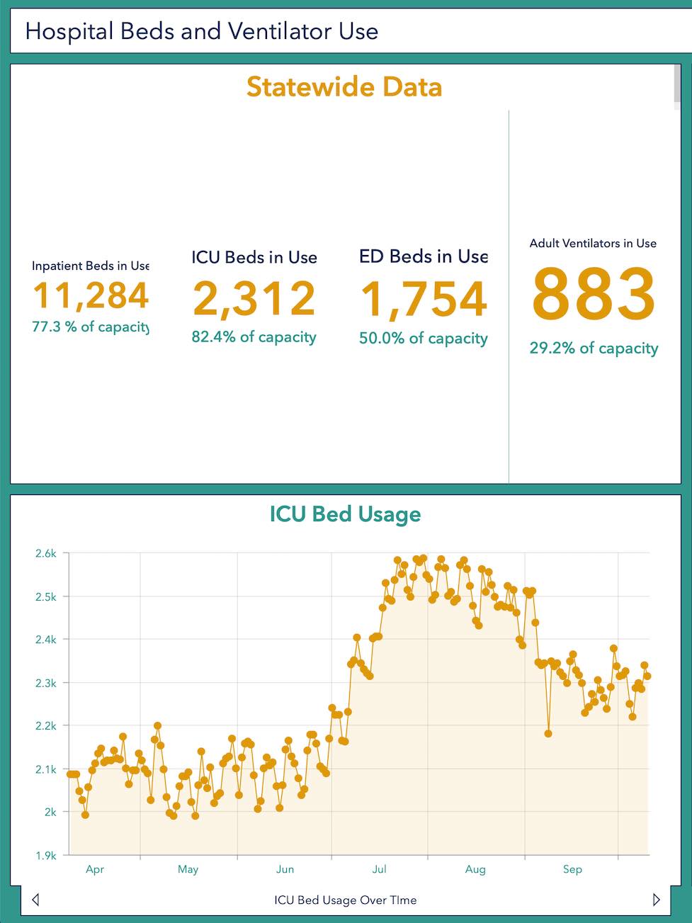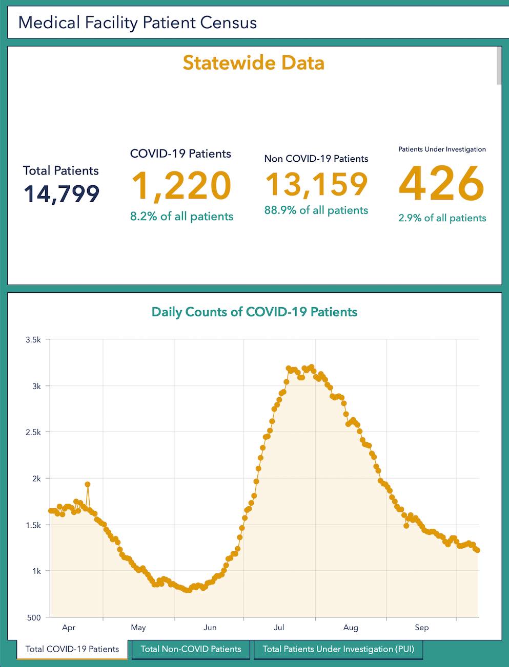 • Sept. 7 — (Labor Day report) 15 newly hospitalized patients; new statewide ICU admissions are 3.