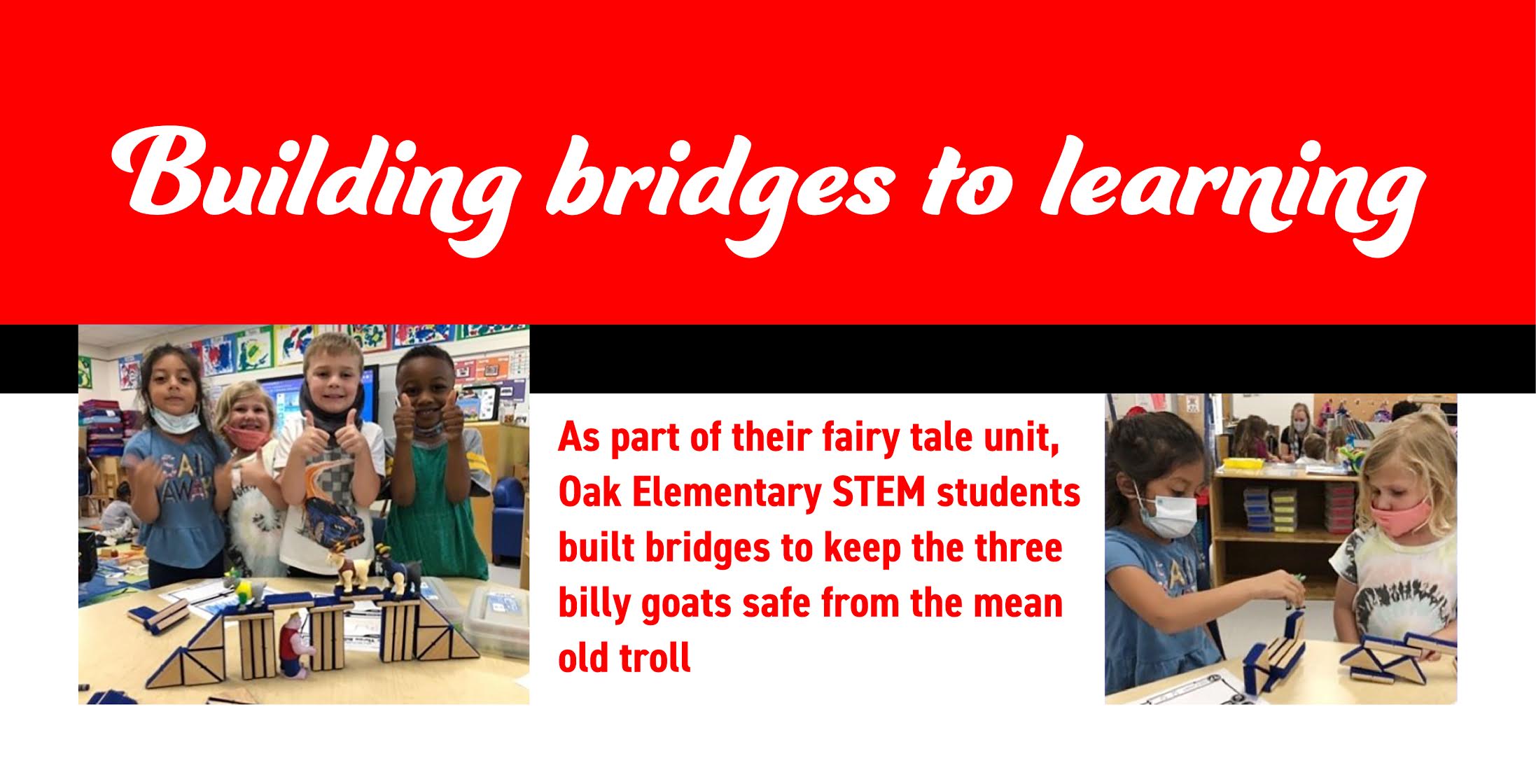 Students turned stories into hands-on learning at Oak Grove Elementary. As part of their fairy tales unit, students enjoyed a STEM activity where they planned, created, and tested bridges to hold up the three billy goats. They also had to make sure the bridge was taller than the mean old troll so the goats could pass by safely.