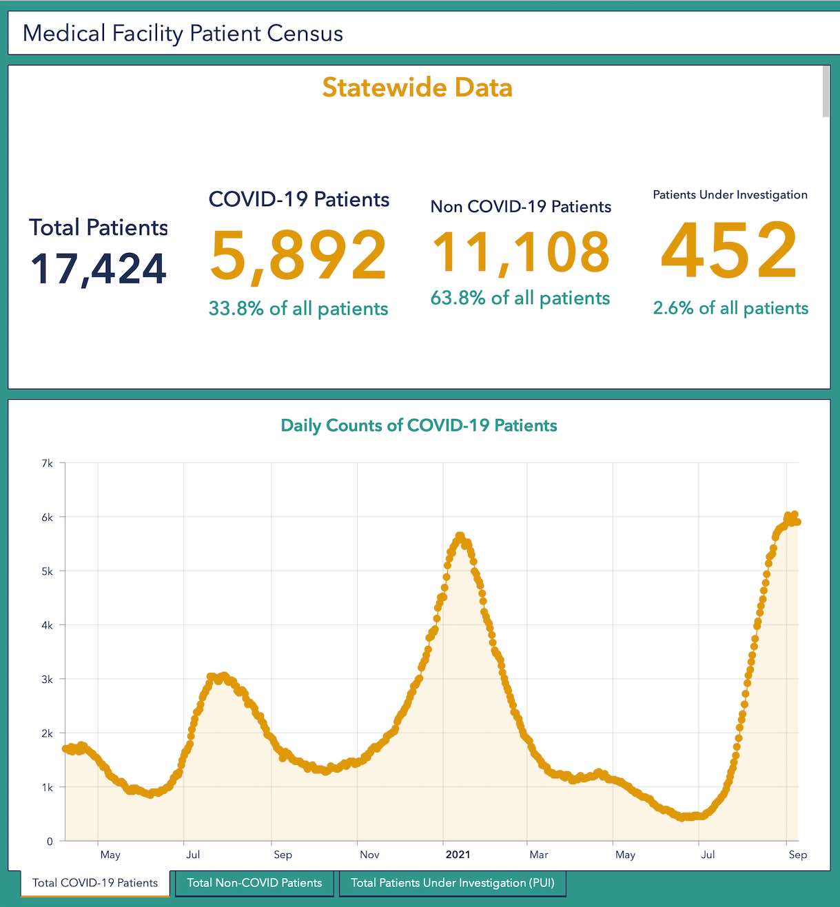 Across the state the biggest concern is bulging hospital admissions. Statewide charts shown below are dramatic: 2,999, or 97.8% of all available ICU beds are filled. The statewide data on numbers of patients in hospitals shows a pandemic peak of slightly more than 6,000 Covid patients is slowly dropping as well. The concentration of Covid patients peaked in recent days at more than 35% of all hospital patients, but has fallen slightly to just under 34% — not a big drop, but a decline nevertheless.