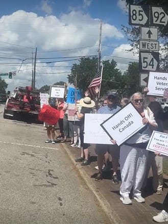 Waving signs toward motorists on Hwy 85, participants stood in solidarity with similar demonstrations held nationwide. The event was part of a broader campaign branded as “HANDS OFF,” which called attention to concerns about democracy, civil rights, and the influence of powerful individuals on public policy.