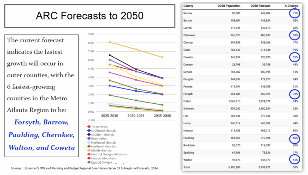 However, Mr. Wilson also informs us that Atlanta’s growth has reached a second stage which moves from the core inner counties of Cobb, Fulton, Gwinnett and Dekalb, out toward counties such as Coweta. The Atlanta regional commission (ARC) has told him so. In fact, their projections show that Coweta is projected to grow sixth as a percentage of current population at 51%. (Below)