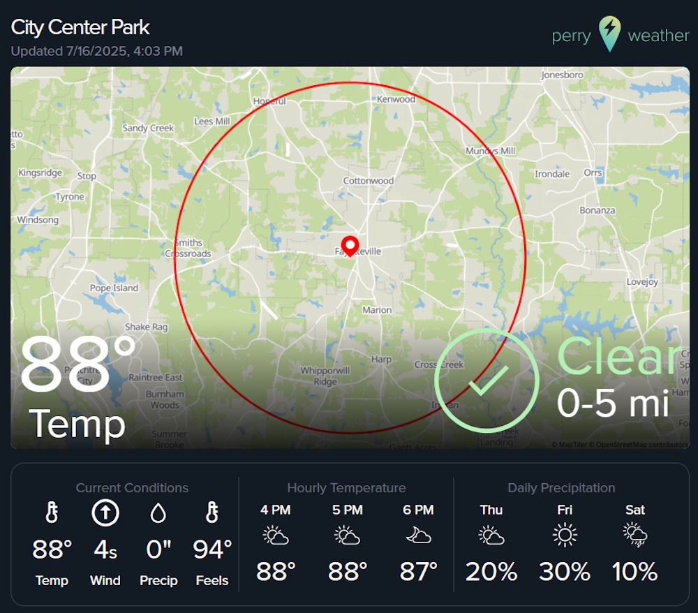 Fayetteville, Georgia (July 17, 2025) The City of Fayetteville has installed and activated a weather station at City Center Park, which not only offers real-time weather updates but also automatically shuts off the spray pad water supply when lightning is detected in the area.