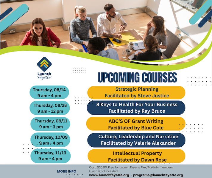 Launch Fayette, Fayette county’s innovation center and business incubator, is pleased to announce our new Business Short Course Series. Each month experts from our community will teach half or full day short courses on topics of value to entrepreneurs and businesses of any size. Our course schedule for the remainder of 2025 is as follows: