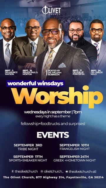 Fayetteville, GA — This September, The Olivet Church invites the entire community to experience Wonderful WINsdays Worship — a month-long celebration of powerful preaching, dynamic worship, and unshakable fellowship. Hosted by Dr. Reverend William Holmes Robinson, Wonderful WINsdays begins every Wednesday at 7 PM with food trucks starting at 5 PM, themed nights, and a life-changing worship encounter you’ll never forget.