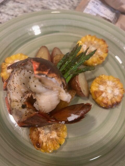 Once the power returned, it was time to serve. The menu included a mixed green salad, lobster bisque, roasted lobster tails, and a celebratory cake (which I did not bake) for later. It was a lot of food, and I was skeptical that they would make it through, but they did.