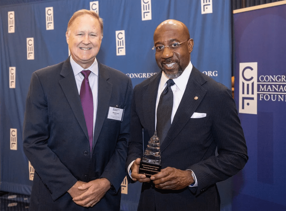 This week, U.S. Senator Reverend Raphael Warnock (D-GA) accepted the Congressional Management Foundation’s (CMF) 2025 Democracy Award for the best Constituent Correspondence & Outreach Services. The award follows the Senator and his office’s outreach efforts to communicate disaster response and recovery resources following Hurricane Helene’s Georgia landfall in September of 2024. The Senator accepted the award at the CMF’s Democracy Awards ceremony. In addition to Senator Warnock, the bipartisan CMF also recognized Congressman August Pfluger (R-TX-11) for his correspondence & outreach services.