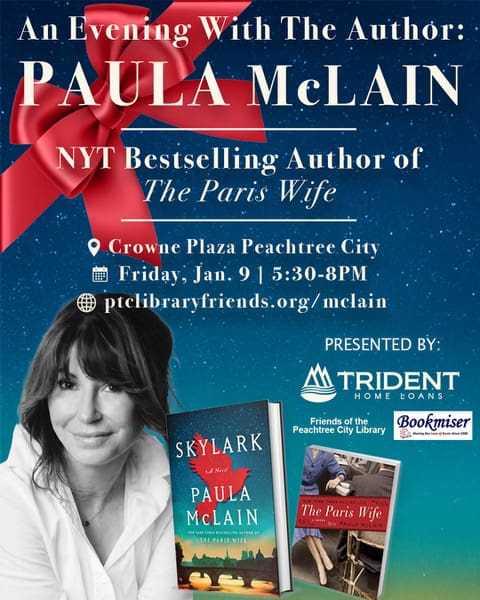 Finally, I want to take the opportunity to plug our “Evening with the Author” event on January 9th with New York Times bestselling author Paula McLain. McLain is best known for her novel, The Paris Wife. Her other titles include A Ticket to Ride, Like Family: Growing Up in Other People’s Houses, Circling the Sun, Love and Ruin, When the Skies Go Dark, and the forthcoming Skylark (January 6, 2026). Event-only tickets are $15; event plus one (1) signed copy of Skylark are $35. It’s the perfect holiday gift for the reader on your list. The event will be held at the Crowne Plaza Peachtree City. Advance reviews of Skylark include a starred review in Library Journal. Our last “Evening with the Author” event back in July was sold out, so don’t wait to purchase your tickets.