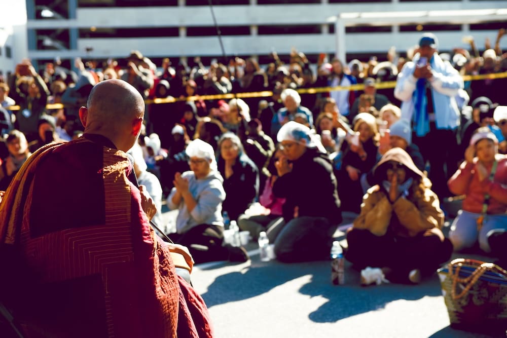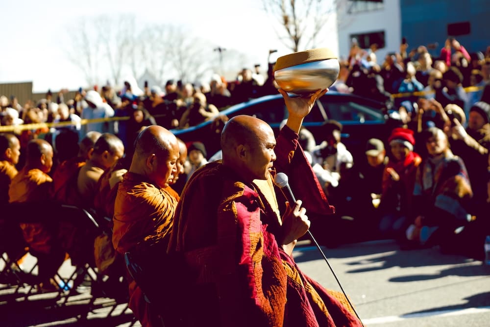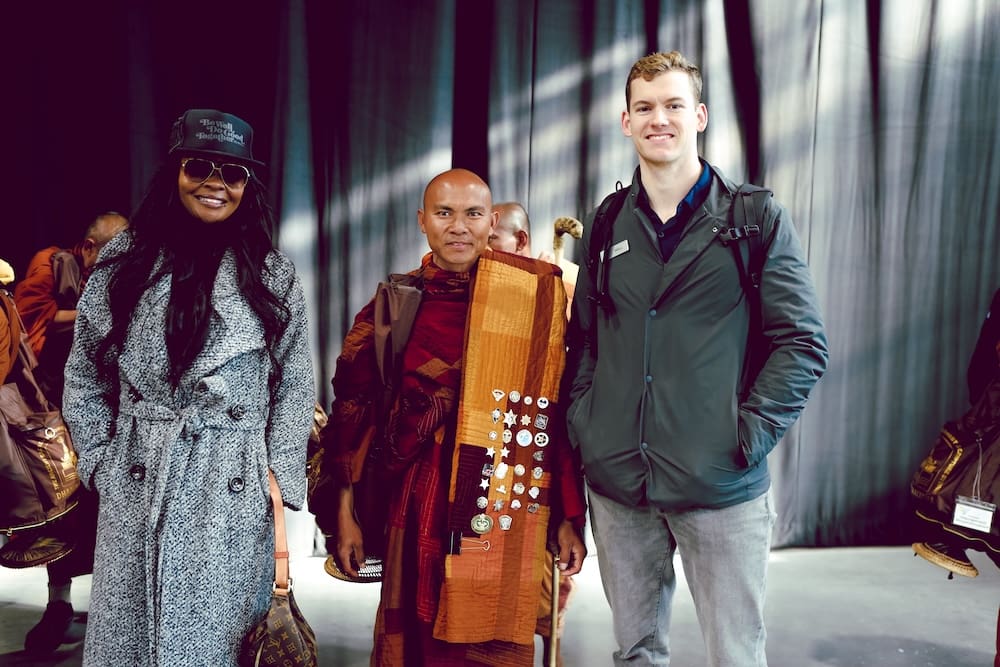 When they entered the venue, cheers and applause broke out as people called greetings and lifted phones to record photos and video. Several attendees likened the moment to the arrival of pop stars, with onlookers crowding walkways and craning for a view as the monks moved through the complex.