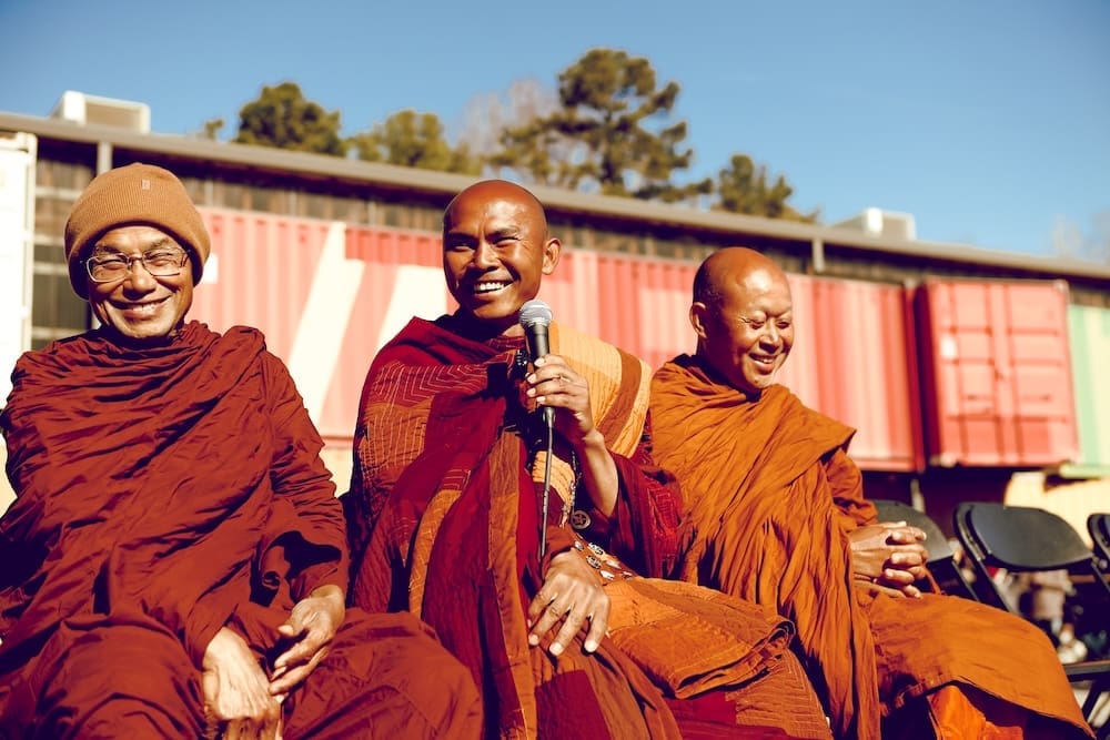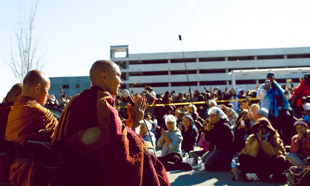 After arriving at Trilith LIVE, the monks walked throughout the venue before entering The Shipyard, where lunch had been prepared. Rather than following their usual routine of eating first, the monks spent extended time engaging with the crowd both before and after lunch, greeting visitors, chanting, speaking briefly, and offering blessings.