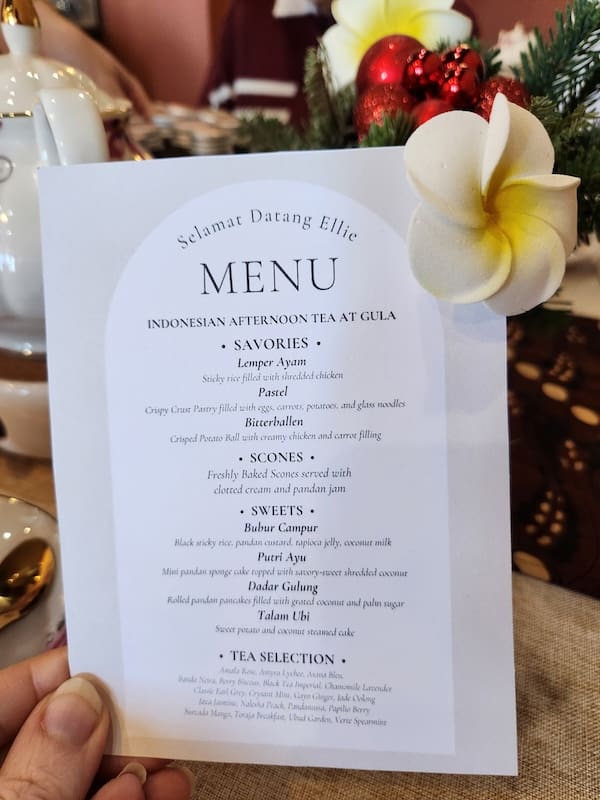 The experience felt immediately right for the occasion—unhurried, visually joyful, and full of things none of us eat every day. Each place setting held a personalized menu printed with our individual names beneath Selamat Datang—“welcome” in Bahasa Indonesia, the Indonesian language—and the table was decorated with cheerful “Happy Birthday” touches for my mom. The menus came with a little floral clip decoration we got to take with us, perfect to pass along to my young nieces.