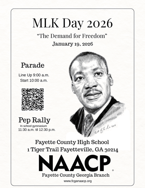 Fayette County, GA — The Fayette County Branch of the NAACP will host its annual Martin Luther King Jr. Day Celebration on Monday, January 19, 2026, and is inviting the entire community to attend the parade and pep rally planned for the day. With the celebration just about one week away, organizers say this year’s program will place a strong emphasis on youth leadership and community healing.