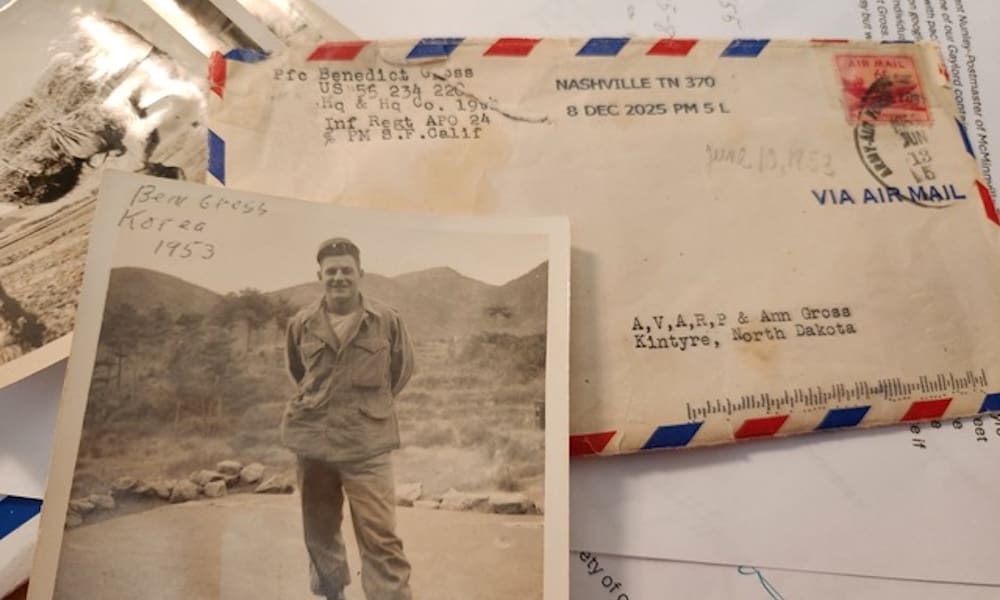 Gross’ brother had mailed roughly two dozen letters Gross wrote home between 1952 and 1953 while he was stationed in Japan and Korea during the Korean War. The letters, saved for decades, were sent together from Bismarck, North Dakota, to Gross in Georgia.