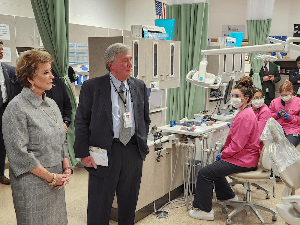 During her tour, McMahon spent time in the dental assisting lab, where students train alongside adult learners through a dual enrollment model.