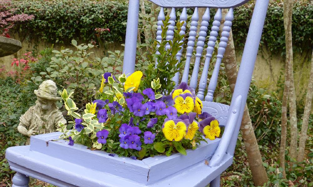 It’s cold and gray outside, but you can still add some color and a splash of cheer to your garden by potting up some winter containers that will carry you through spring and beyond. Be creative and think outside the pot! Anything that can hold water and has a drainage hole can make a great container. Pick something unusual – My husband removed the seat from an old chair and added a frame of screen in its place to hold annuals – it makes a fun statement.
