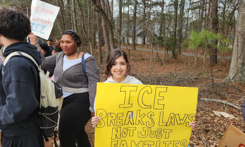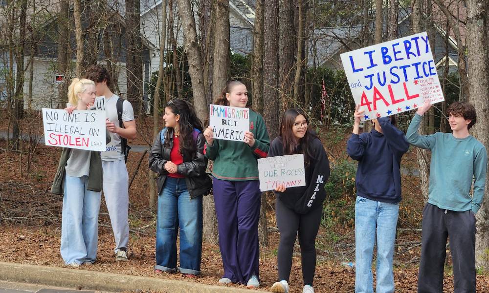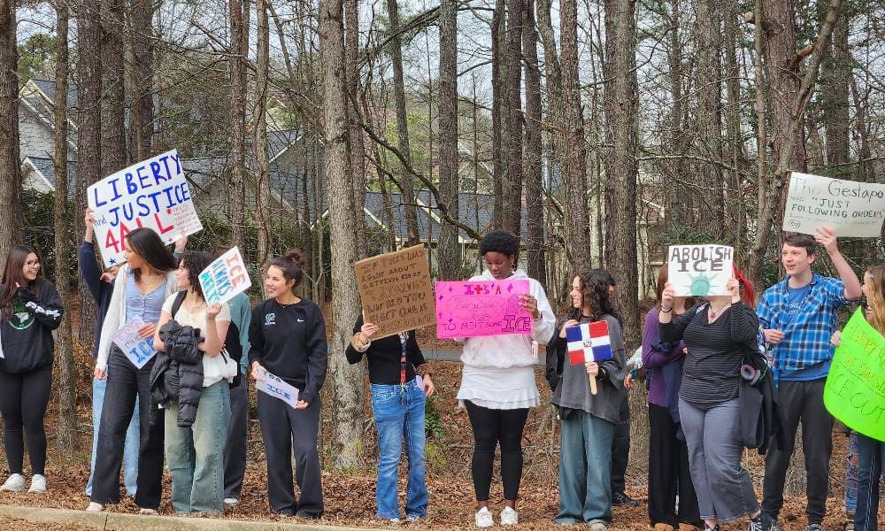 After protesting in front of the school for approximately 40 minutes, students left the campus area and continued their demonstration along Peachtree City’s golf cart paths. The group walked down Peachtree Parkway, crossed Highway 74, and ended the protest near a Walgreens. As they moved along the route, students also chanted “Whose streets? Our streets!” and “Hey, hey! Ho, ho! ICE has got to go!”