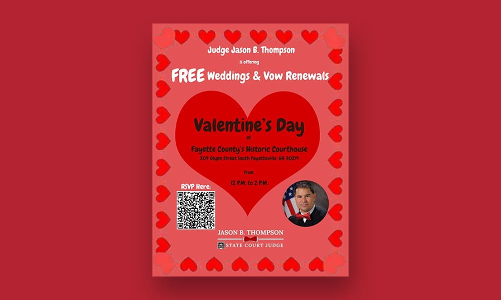 FAYETTEVILLE, GA — February 14, 2026 — Love is in the air in Fayetteville! Judge Jason B. Thompson is spreading the Valentine’s Day joy by hosting FREE Weddings and Vow Renewals on Saturday, February 14, 2026, from 12:00–2:00 p.m. at the historic Fayette County Courthouse.