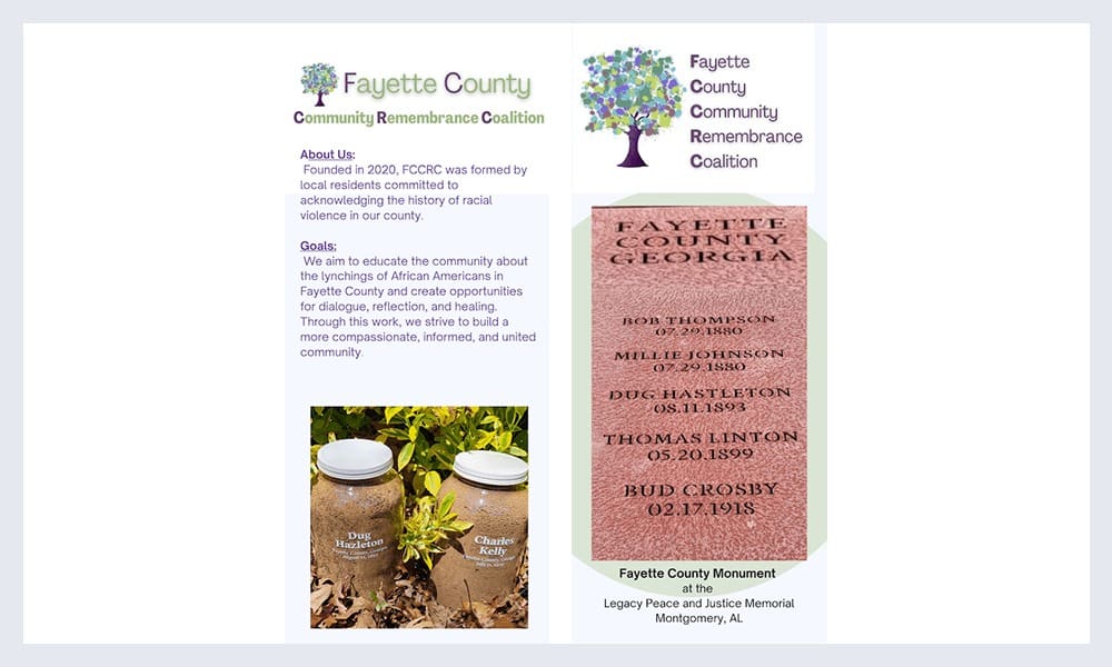 One of FCCRC’s main goals is helping residents understand that racial injustice happened locally. Bryant says, “Racial injustice isn’t just in history books. It happened here to people who lived and worked in this county.” Through research supported by the Equal Justice Initiative (EJI), FCCRC has documented multiple lynchings in Fayette County, with more cases still under investigation. Individuals memorialized include: