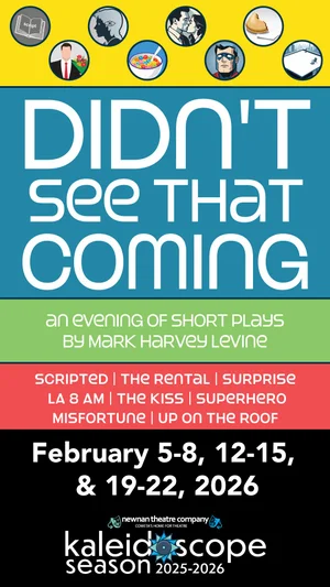 NEWNAN, GA – February 19, 2026 – Newnan Theatre Company’s 2025-26 Season continues with Didn’t See That Coming, eight short plays that explore romance, friendship, and the unpredictable turns of life by playwright Mark Harvey Levine. This first-of-its kind program for Newnan Theatre Company presents a unique opportunity for new directors Crystal Booth, Harrison Ford, and Janet Marie Gunnels to work with some of your favorite actors on the intimate Julie Hunter Marchese Theatre Blackbox stage. The lineup of plays is: