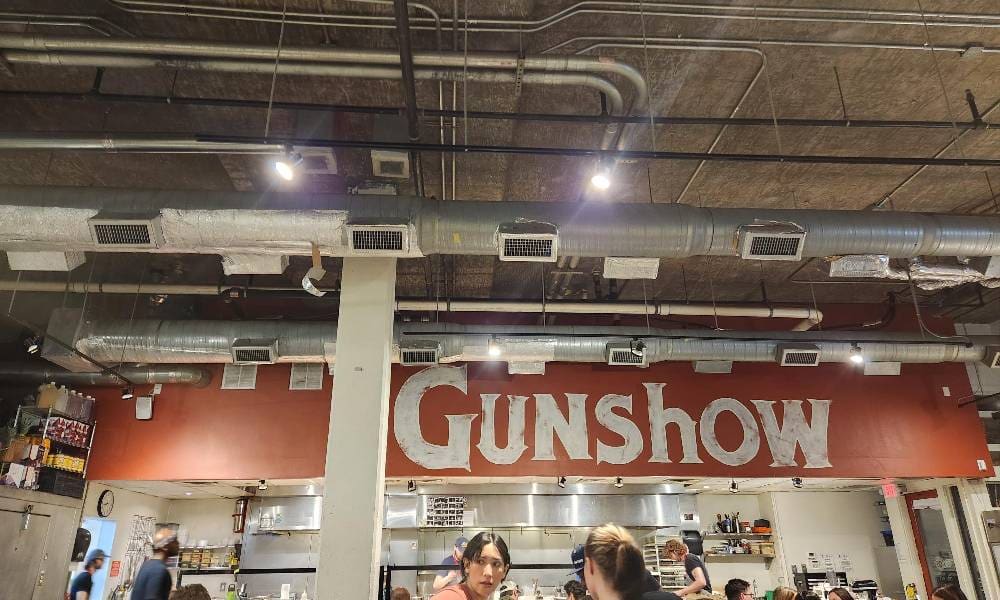 Gunshow doesn’t scream elegance. It’s concrete floors, an open kitchen, shared cafeteria-style tables. Our friend Bob had read that this design is intentional — stripping away visual distraction so the focus remains entirely on the food.