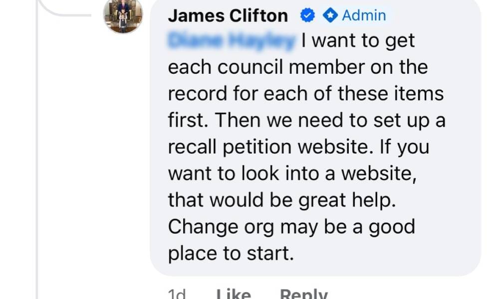 In a recent Facebook comment, Clifton wrote, “I want to get each council member on the record for each of these items first. Then we need to set up a recall petition website.”