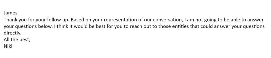 After the meeting, Clifton published claims about what Vanderslice had told him, then sent her follow-up questions. Her written reply: “Based on your representation of our conversation, I am not going to be able to answer your questions below. I think it would be best for you to reach out to those entities that could answer your questions directly.”