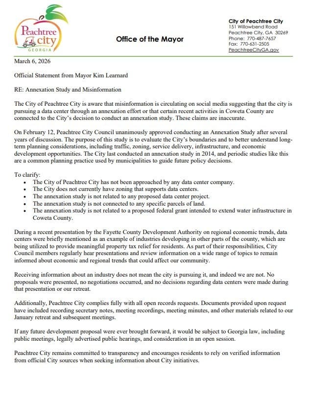 Council Member Clint Holland, who pushed for the annexation study, told The Citizen in writing: “To be clear, what is posted online about data centers for Peachtree City is not true. As of today, no data center company has approached the city to discuss placing a data center in Peachtree City.”