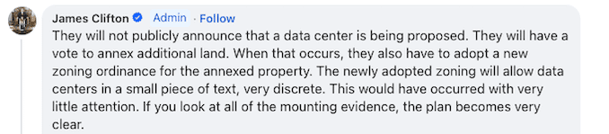 He also made sure the story could not be corrected. He has told his followers that city officials “will not publicly announce” the data center, framing every denial as proof of the cover-up rather than evidence against it.