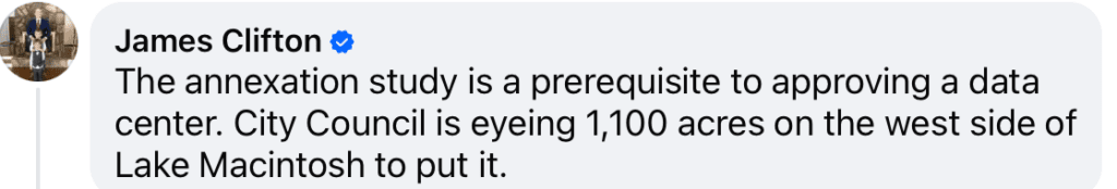 I obtained through an open records request an email a Peachtree City resident sent to city council asking a simple question: Is it true that a survey is being done that would allow for a data center to be put in Peachtree City? She had read Clifton’s posts and did not know what to believe. City Manager Justin Strickland responded the same day to reassure her that the annexation study is a general boundary review, that council has given no direction to pursue a data center, and that the city’s current ordinances do not permit one.