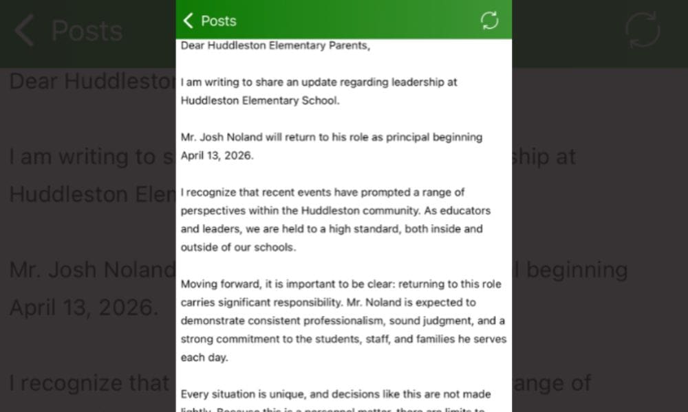 “As a parent at Huddleston Elementary, I just want to express how grateful I am to see Mr. Noland returning,” the parent said. “He has been such a positive influence on our school community and has done so much for our students and families. We all make mistakes, but his dedication, leadership, and care for the kids have always been clear. I’m thankful our school has him back and look forward to the continued impact he’ll have on our children.”