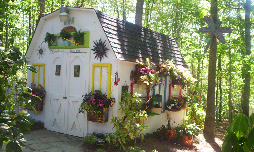 If you don’t have the time, energy or the will to build your own garden shed, you can purchase a ready-made, utilitarian shed from a big box store and then add your own personality. I saw one such shed on a garden tour where window boxes and whimsical designs were added to a basic garden shed purchased at a store. It added such charm and personality to the garden.