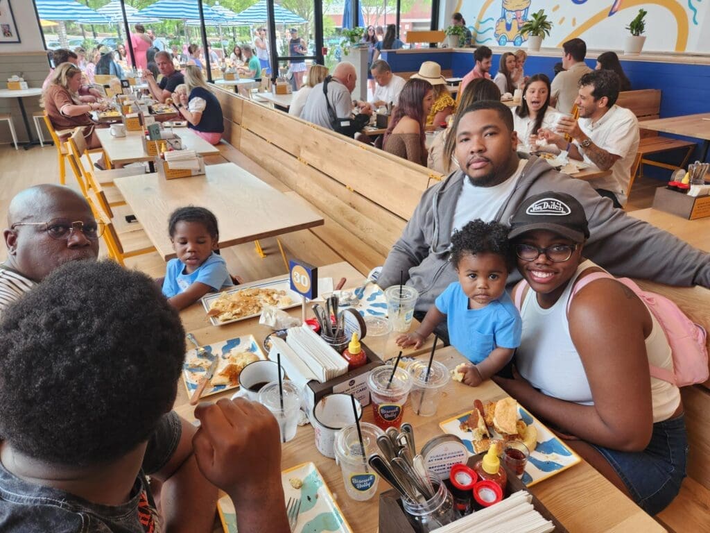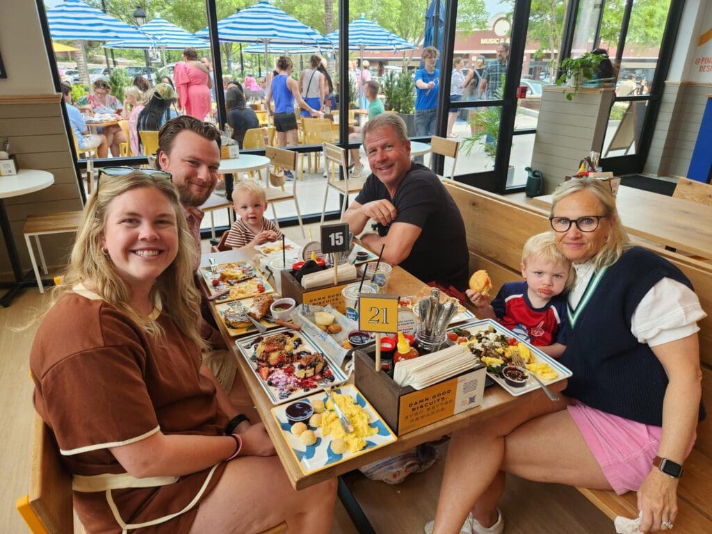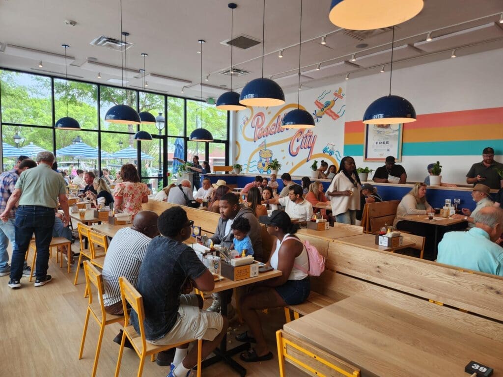 The Louisville-based, Southern-inspired breakfast and brunch spot will officially open Tuesday, April 21, but the restaurant was already buzzing during its family-and-friends preview, with close to 200 guests cycling through in just a few hours. The noise level matched the energy: families, couples, and curious locals filling tables, snapping photos, and digging into towering biscuit sandwiches.