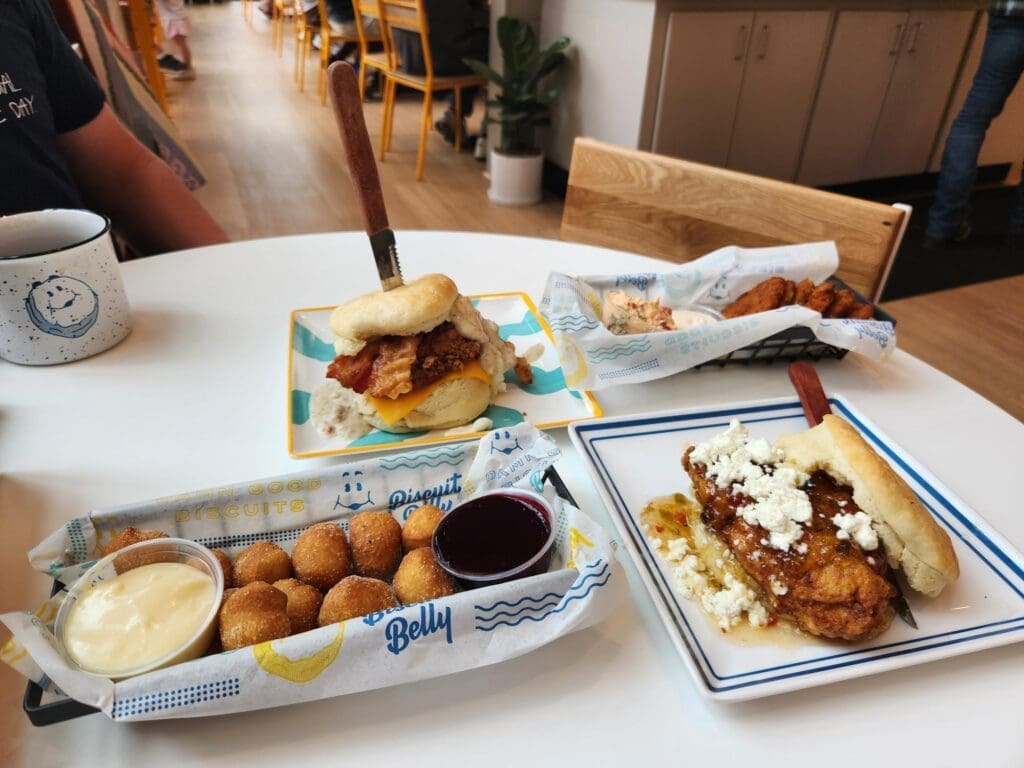 At its core, Biscuit Belly is built around what Coulter calls “the Southern-inspired big party biscuit sandwich,” a menu that leans playful, indulgent, and unapologetically over the top.