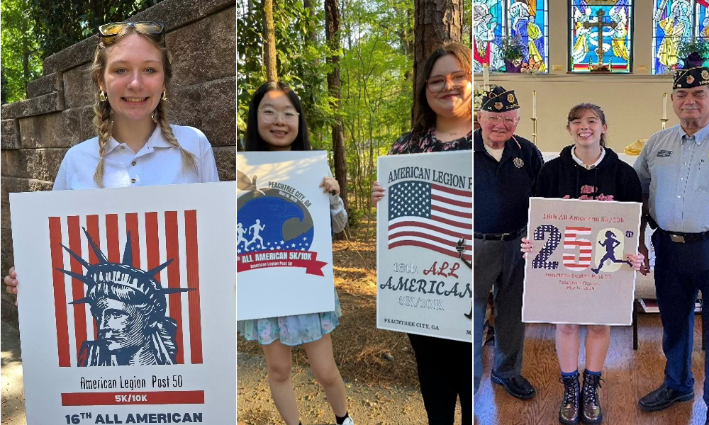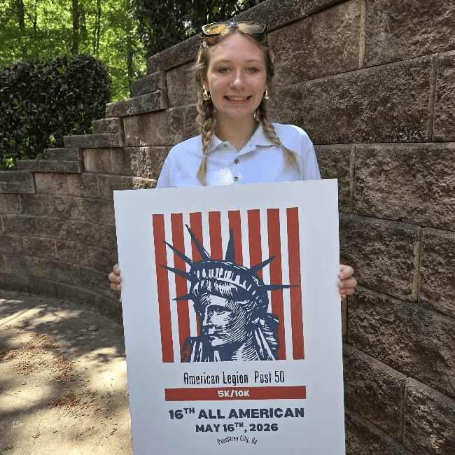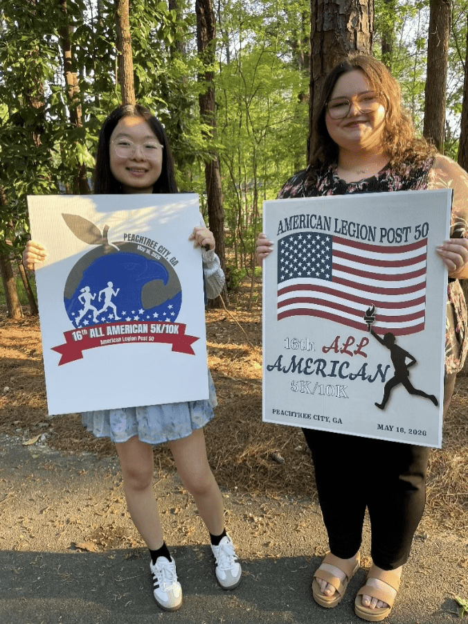 Upon completion of the voting, the top four finalists, Delilah Godwin and Bix Taylor from the Foundry Academy; Linda Yang from Starr’s Mill High School, and Emily Dykes from Sandy Creek High School, along with their parents and respective art teachers were invited to Post 50’s awards dinner. In succession each of their respective art works were revealed to the audience. Each contestant received a monetary award and a Legion certificate of achievement recognizing their participation and contribution to the contest. Delilah Godwin, as the first-place winner, received an extra award: her artwork will be the featured artwork printed on this year’s All American 5K/10K race t-shirt – making it a one-of-a-kind collectible.