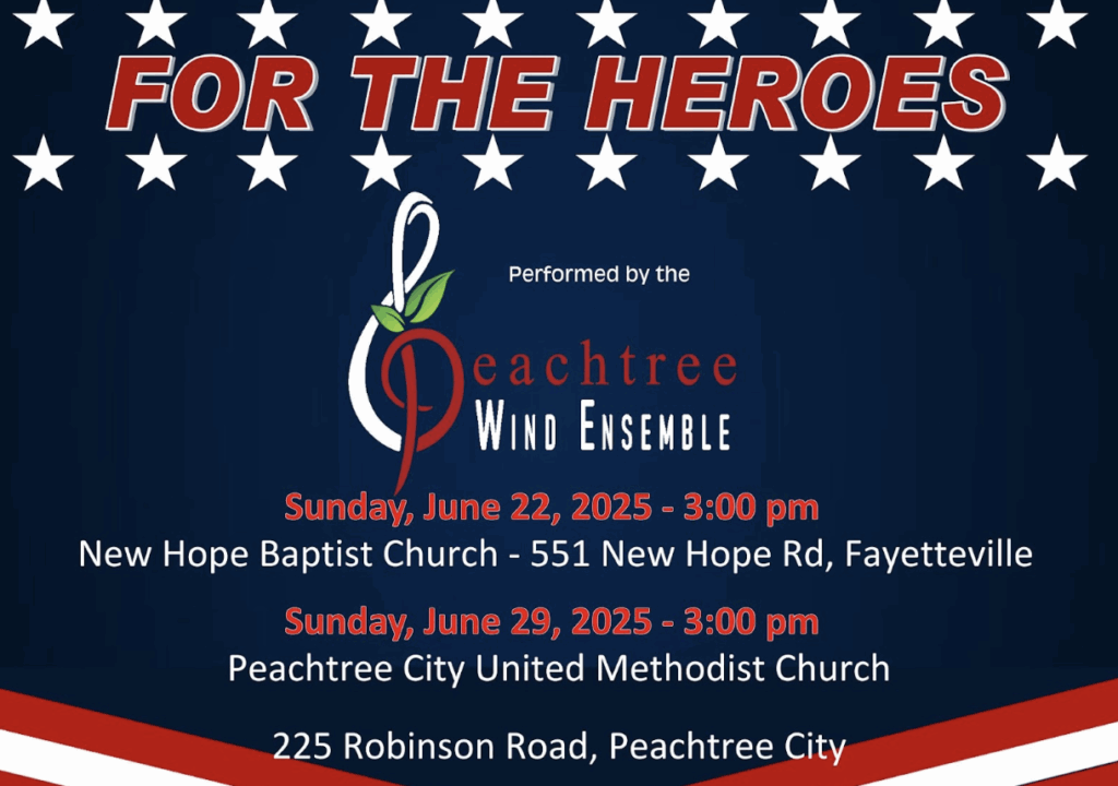 The Peachtree City Wind Ensemble will present A Patriotic Band Concert for the Heroes on June 22 and June 29 to honor America, its freedom, and those who serve and