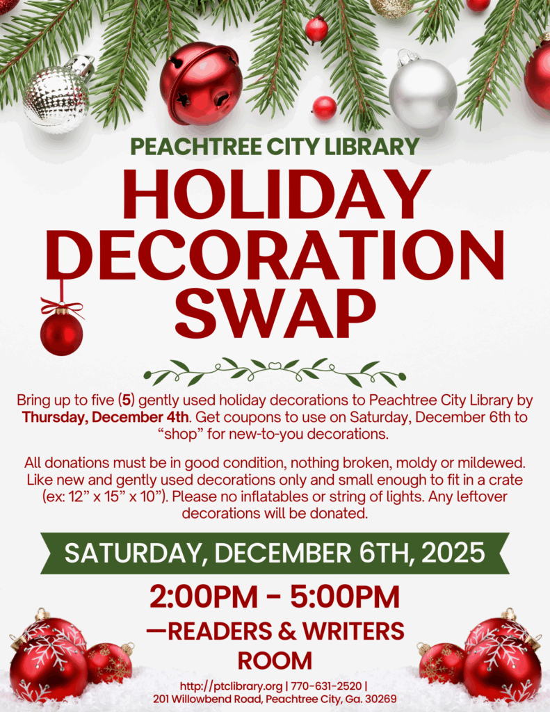 Thinking about changing up your holiday decorations this year? Bring up to five (5) gently used holiday decorations to the Peachtree City Library by Thursday, December 4th. Get coupons to